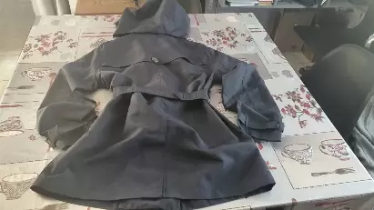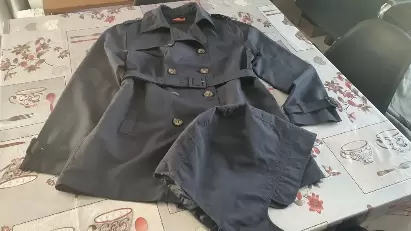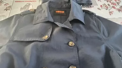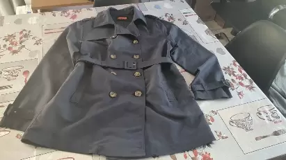 Chamarra tipo gabardina color azul marino, con gorro desmontable.Marca Lulumari, talls grande. Cinturón del mismo material y. cintillas en las mangas. Cuenta con todos los botones.Excelente calidad del material con la que está hecha la chamarra.No ha sido utilizada.