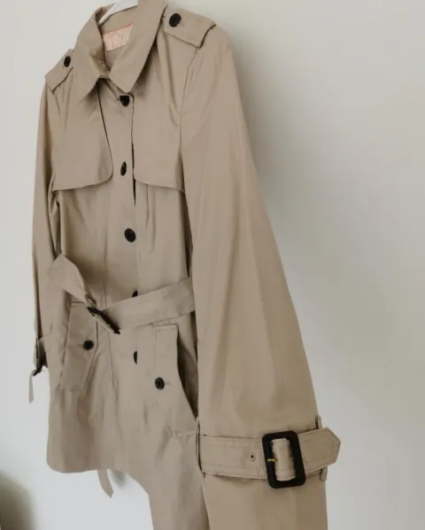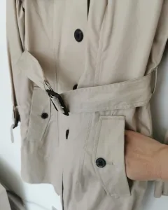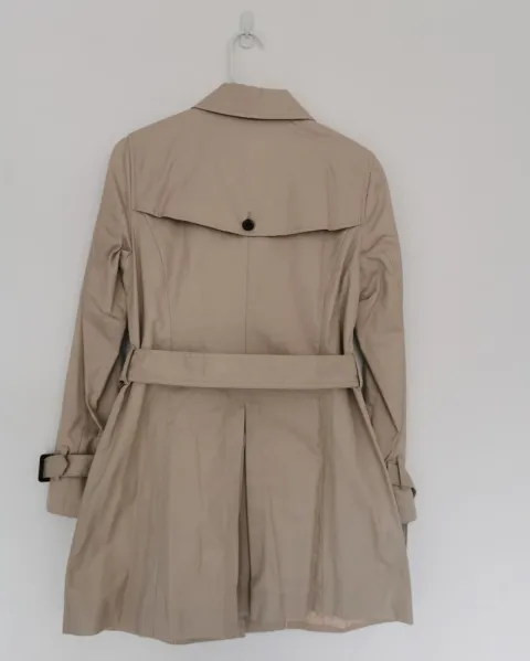 Gabardina de tela tipo lona. Color beige de cinco botones. Cuello con solapa. Bolsillos de jareta con solapa y boton al frente para meter las manos. Solapas al frente y en la espalda, la de la espalda tiene botón. Cinturón de tela. En los puños de las mangas tiene cinturones en para ajustar el ancho. Talla M.