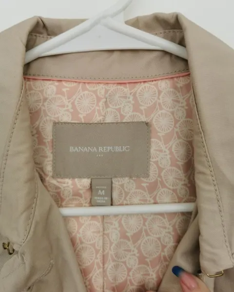 Gabardina beige Banana Republic. Gabardina de tela tipo lona. Color beige de cinco botones. Cuello con solapa. Bolsillos de jareta con solapa y boton al frente para meter las manos. Solapas al frente y en la espalda, la de la espalda tiene botón. Cinturón de tela. En los puños de las mangas tiene cinturones en para ajustar el ancho. Talla M.