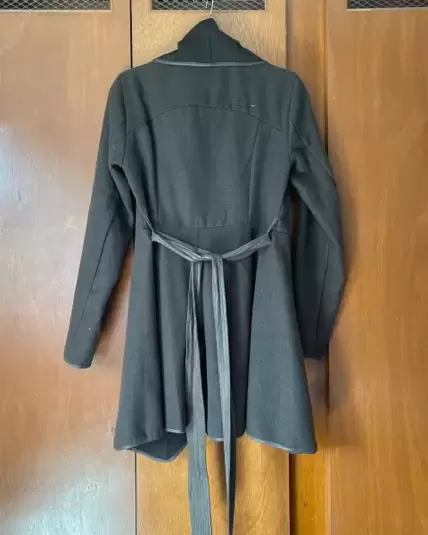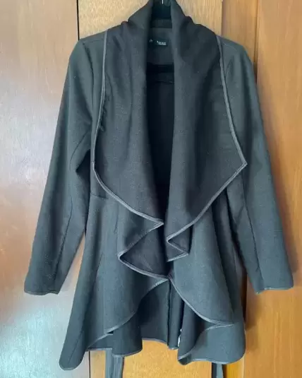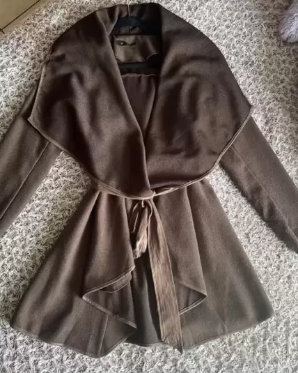 Gabardina color cafe felpa con cinto es usada, talla grande, tiene unos detalles en la parte de enfrente