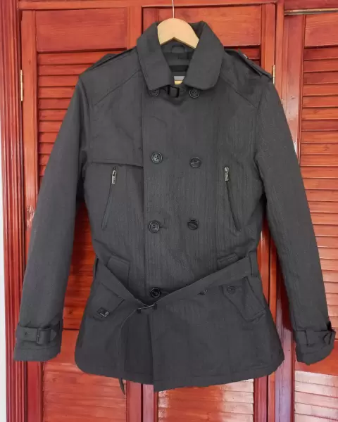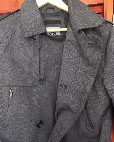 Gabardina gris oxford. Bonito abrigo gris oxford para caballero condenable de cintos en cuello cintura y puños. Por dentro tiene bolsillos y viene forro alcolchonadito como de chamarra se ve calientito.