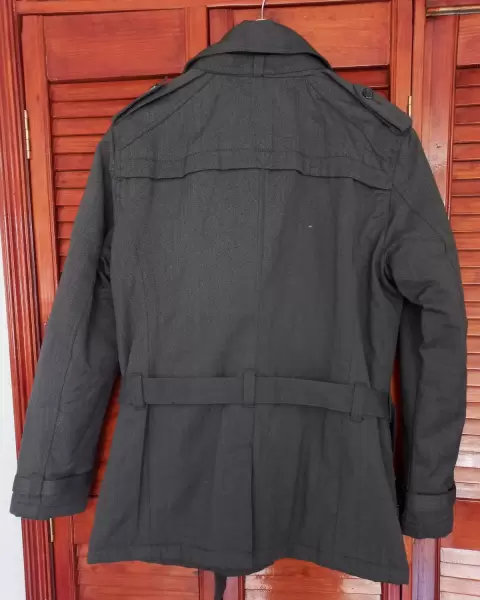 Bonito abrigo gris oxford para caballero condenable de cintos en cuello cintura y puños. Por dentro tiene bolsillos y viene forro alcolchonadito como de chamarra se ve calientito.