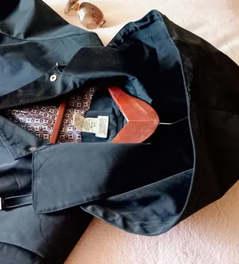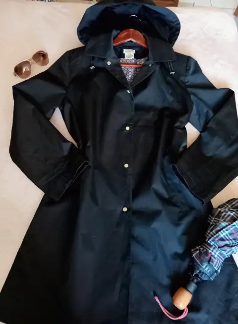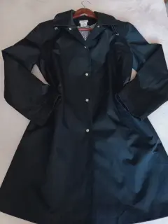 Linda gabardina holgada talla grande, ligera, impermeable con capucha desmontable, forro, discretos botones plateados de presión, plateados debolsas a los costados, no esta usada pero tiene unos pequeñas manchas en las mangas casi imperceptibles, de ahí es más es una excelente gabardina.