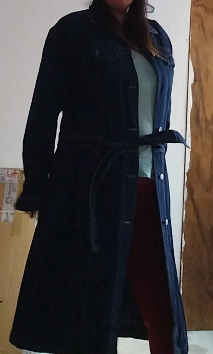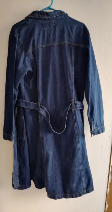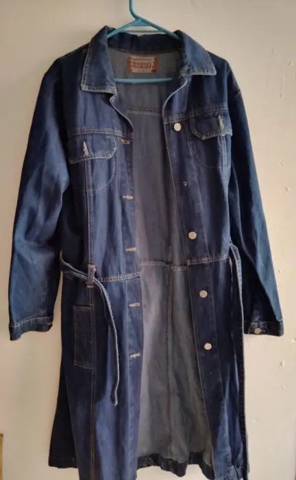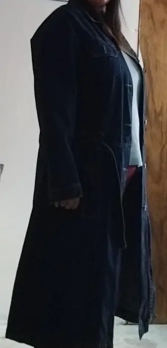 Gabardina larga de mezclilla azul oscuro. - Gabardina larga (110 cm)- Mezclilla azul oscuro- De los hombros mide 43 cm.- Los brazos miden 60 cm.- Talla Grande.- Faltan 2 botones marcados en foto.- 5 puestas.- Minifalda trapeada.- Mide 35 cm- Color caqui.- Tiene una hebilla en un costado.- Es de cierre.-Talla 9- Es de mujerHemos notificado a la compradora que has su oferta.Hemos notificado a maria2374 que has realizado una oferta.¡Baja el precio de la