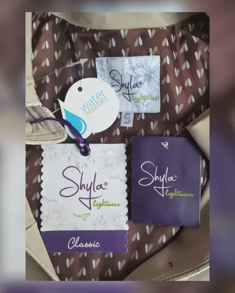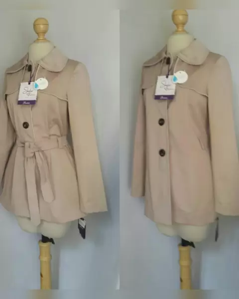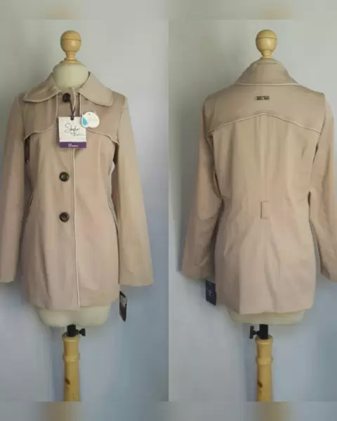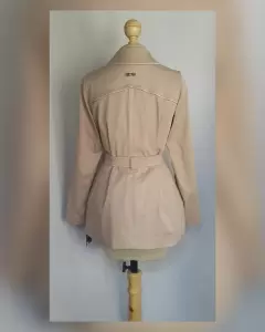 Gabardina Lightwear Impermeable Bies. Gabardina lightwear (water resistant/breathable) color BEIGE AVENA, cuello clásico c/solapas, cierre p/botonadura, 2 bolsos vivo laterales, bies efecto brillo zonas frontal, trasera y cuello, solapas antitormenta delanteras y trasera, placa metálica c/logotipo de la marca en espalda, trabillas en cintura, cinturón mismo tejido p/mejor ajuste y forro fantasía interior. Talla G. Dimensiones cms: 38 hombro, 57 axila, 51 cintura, 60 zona baja, 73 largo, 61 largo manga. 60% poliéster, 37% algodón, 3% elastano. Para lavando en seco.***Prenda tratada con nanotecnología que le permite soportar lluvias de ligeras a medias y ser totalmente transpirable y ligera.***
