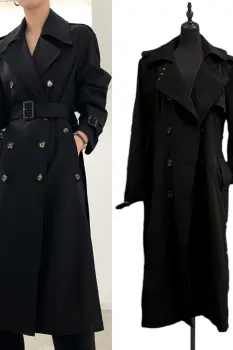 Gabardina negra larga el diseño viene con doble fila de botones, bolsillos laterales y solapa en la parte de arriba del cuello. ojo el diseño viene sin cinturon, solo es medio cinto ver 3 foto.Medidas:Hombro a hombro: 50 cmAxila a axila: 63 cmLargo: 132 cm