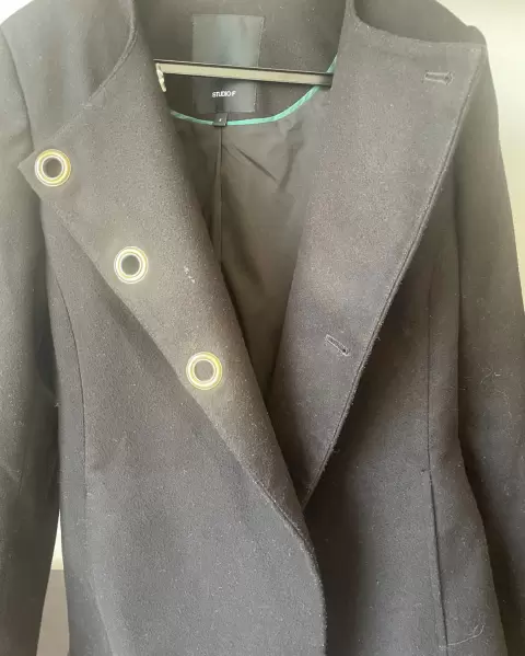 Gabardina negra de Studio F, esta en excelente estado, ligeramente maltratada, casi nada.
