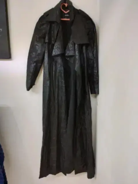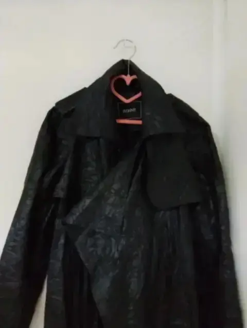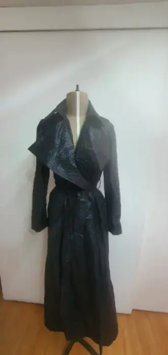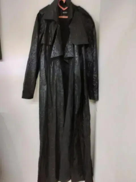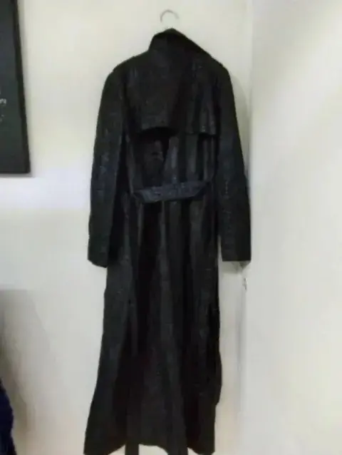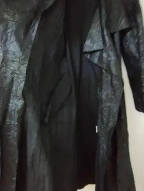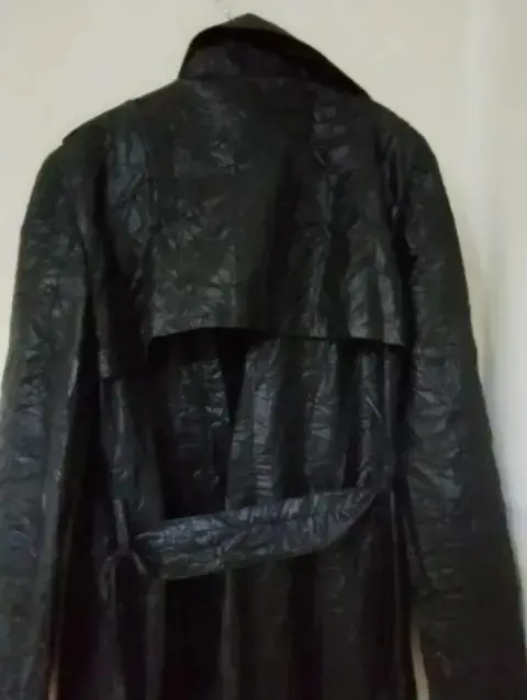 Gabardina negra, super larga, es hermosa. La tela es vinil. Esta nueva. Es super larga y tiene solapas muy elegantes