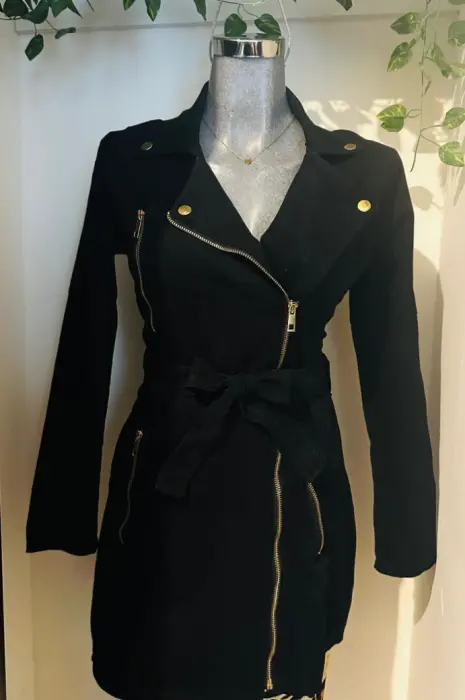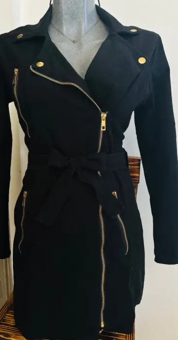 Gabardina tipo vestido. 🖤Gabardina Negra con cinturón y cierre 🖤Corte elegante da Perfecto para una talla mediana o Ch🖤Sus medidas son 51 de axila la tela tiene un poco de strech puede medir hasta 56 de axila cintura 47 hasta 50 un poco más por el strech y de largo76 💐Cualquier duda con gusto💐