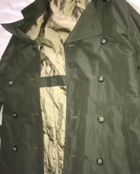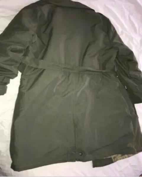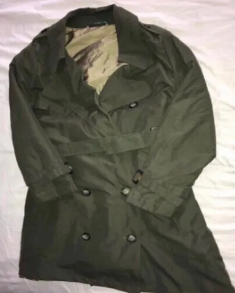 Gabardina marca canda, color verde militar, talla M-L está en perfecto estado solo de uso una vez.no tiene detalles de uso