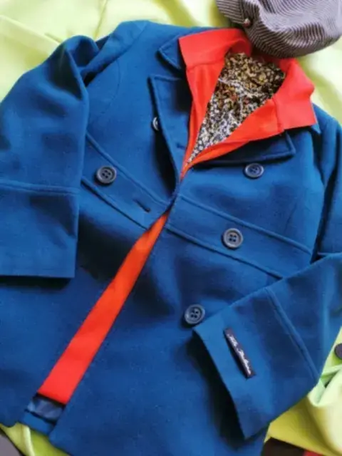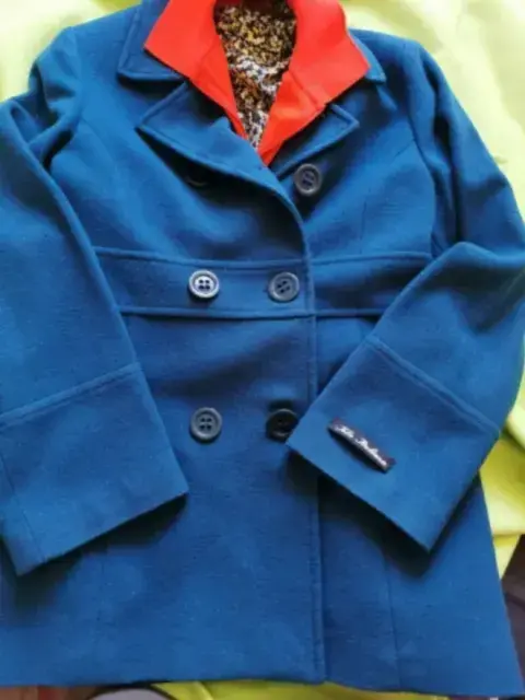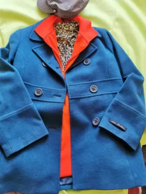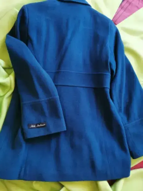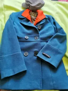 Abrigo de lana Italiana, Cruzado con bolsas, talla mediana, color azul/verde. En excelente estado.