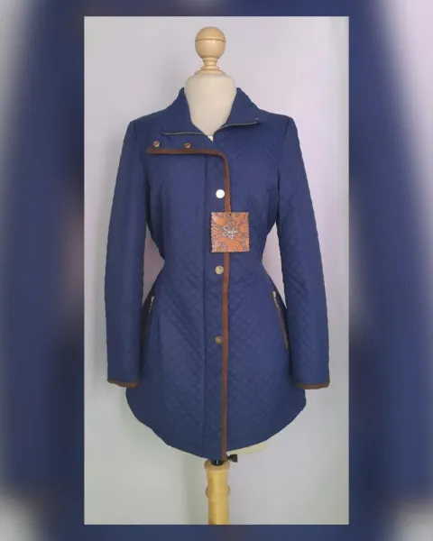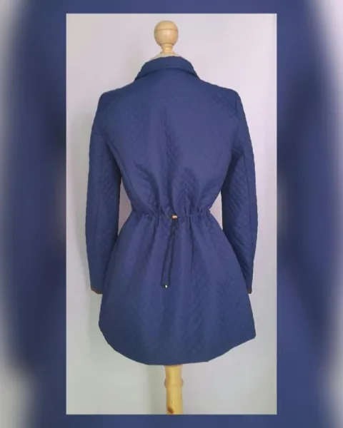 Parka Acolchada Ligera aplique Fake Fur Azul. Parka ligera acolchada tono AZUL COBALTO c/bies fake fur tono CHOCOLATE cuello/zona frontal/puños, cuello clásico convertible a cuello alzado, cierre p/cremallera oculta p/tapeta c/snaps, 2 bolsos vivo c/cremallera, elástico trasero ajustable cintura y forro interior fantasía. Talla M. Dimens cms: 39 hombro, 52 axila, 46 cintura, 62 zona baja, 81 largo, 60 largo manga. 100% poliéster. P/lav seco