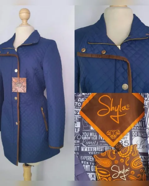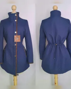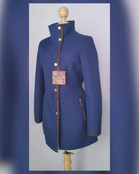Parka ligera acolchada tono AZUL COBALTO c/bies fake fur tono CHOCOLATE cuello/zona frontal/puños, cuello clásico convertible a cuello alzado, cierre p/cremallera oculta p/tapeta c/snaps, 2 bolsos vivo c/cremallera, elástico trasero ajustable cintura y forro interior fantasía. Talla M. Dimens cms: 39 hombro, 52 axila, 46 cintura, 62 zona baja, 81 largo, 60 largo manga. 100% poliéster. P/lav seco