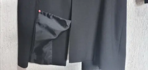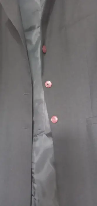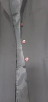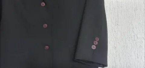 Color negro, 3 botones al frente, 3 botones en cada manga, 1 bolsa simulada en la parte superior izquierda, 2 bolsas simuladas en la parte inferior, abertura en la parte posterior, 88 cm de largo, 42 cm de ancho de hombro a hombro 52 cm de largo de manga.