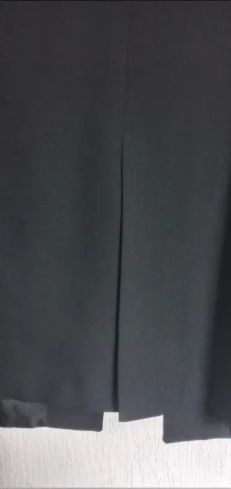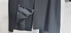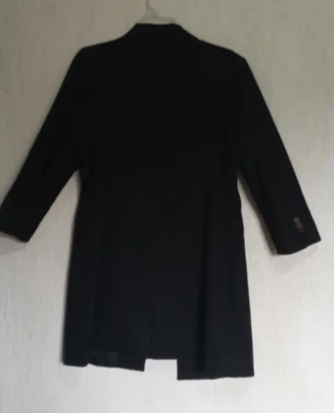Saco largo con forro color negro. Color negro, 3 botones al frente, 3 botones en cada manga, 1 bolsa simulada en la parte superior izquierda, 2 bolsas simuladas en la parte inferior, abertura en la parte posterior, 88 cm de largo, 42 cm de ancho de hombro a hombro 52 cm de largo de manga.
