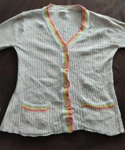 HERMOSO SUETER DE PUNTO COLOR BEIS CON LINEAS AMARILLAS Y NARANJA, ES TALLA S, PERO QUEDA A M, PERFECTAMENTE. NO PUEDE FALTAR EN TU CLOSET...