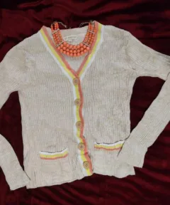 SUETER BEIS CON NARANJA Y AMARILLO. HERMOSO SUETER DE PUNTO COLOR BEIS CON LINEAS AMARILLAS Y NARANJA, ES TALLA S, PERO QUEDA A M, PERFECTAMENTE. NO PUEDE FALTAR EN TU CLOSET...