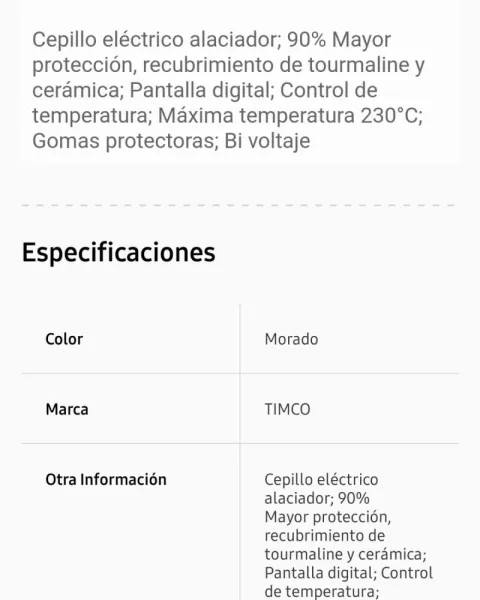 Hermoso cepillo alaciadorMarca Timco color moradoSolo la use una vez, la tengo sin caja.