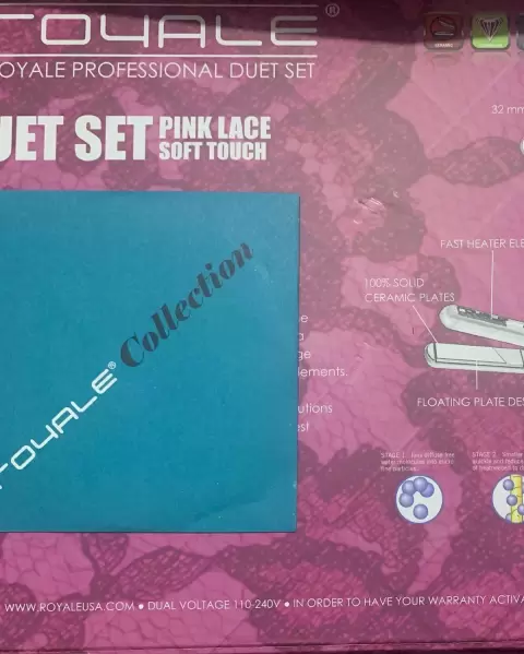 Duet Set Royale -plancha Para Cabello Y Rizadora. 🦋Contenidos del paquete:✅1 Plancha Clásica✅ Rizadora de cerámica✅1 pinzas profesionales para el cabello Royale✅Punta de 18 mm en la base que se reduce a un diámetro de 9 mm✅Punta de 25 mm en la base del cañón que se reduce a un diámetro de 18 mm✅DVD de instrucción de Royale sobre cómo usar nuestra plancha de cerámica de Royale para lograr resultados de calidad de salón en la comodidad de su hogar.