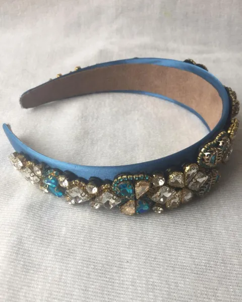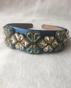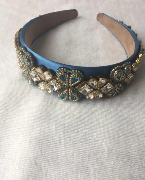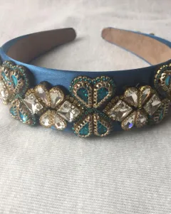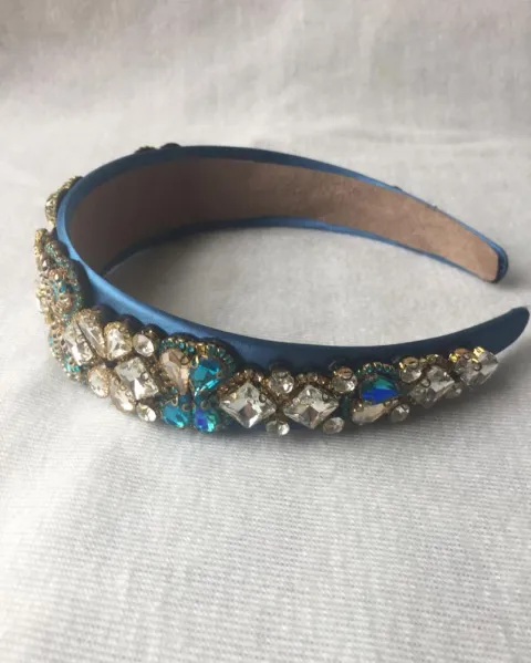 Diadema en tela de satén de excelente calidad, con pedrería de cristal bordada tipo barroco.