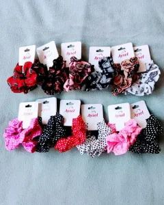 Scrunchies paquete C/6 pares. Hermosísimos Scrunchies nuevos con etiqueta, arma tus looks de cada día o las de tu princesa con estos lindísimos colores y diseños, el paquete incluye 6 pares de cada color, osea que en total recibirás 12 piezas. Los productos se envían en cajas o sobres recicladas.