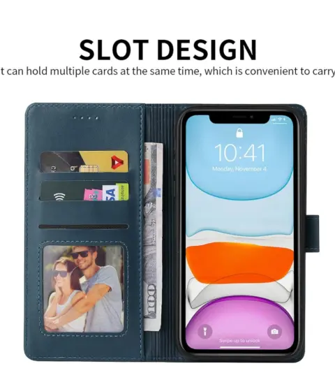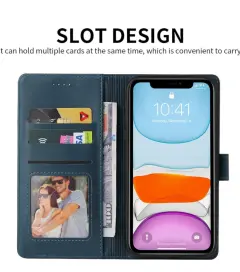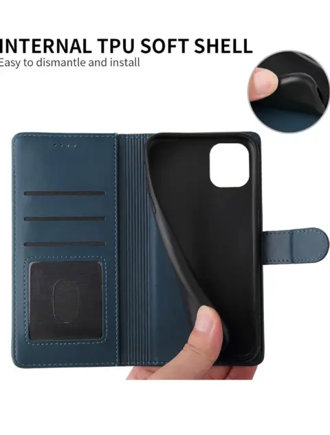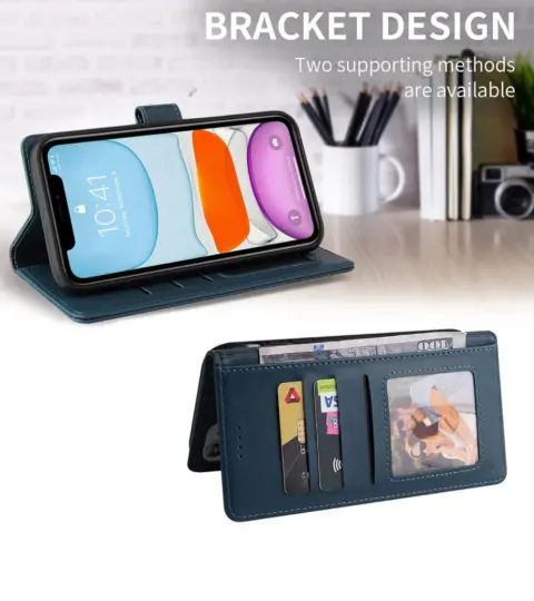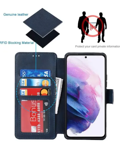 CASE IPHONE 14 PLUS. Funda para iPhone 14 plus,funda tipo cartera de piel con espejo y correa de muñec color azul