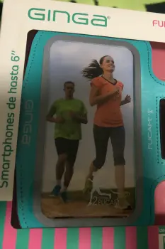 Funda deportiva GINGA. Es color verde menta con detalles rosas.El plástico no interfiere con la funcionalidad de la pantalla de tu móvil.