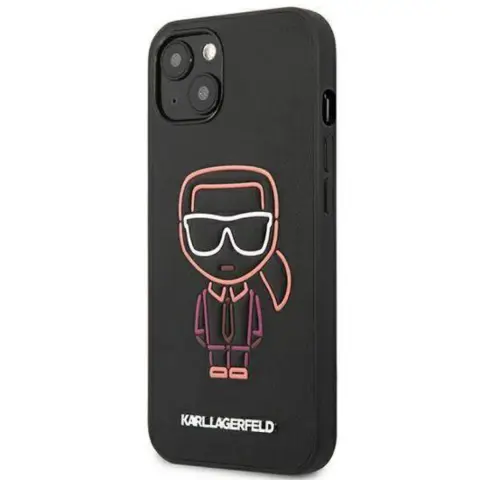 Funda Karl Ikonik Outline iPhone 13. Funda rígida compatible con iPhone 13, color negra con diseño Karl Ikonik Outline multicolores y logo resaltado en color plata.