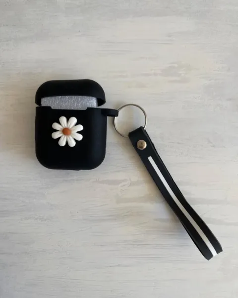 Funda para AirPods. Funda negra de silicona suave, decoración al frente de flor blanca. La tapa está unida a la base. Protección al hueco del cargador y se puede oprimir el botón trasero desde la funda. Incluye el llavero.