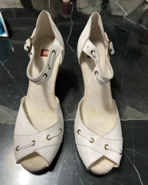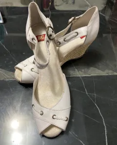 Alpargatas blancas tacón de 8 cms, punta boca de pescado con adornos de trenzas tejidas, nuevas de piel