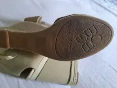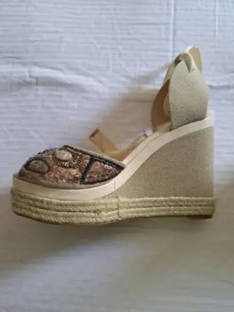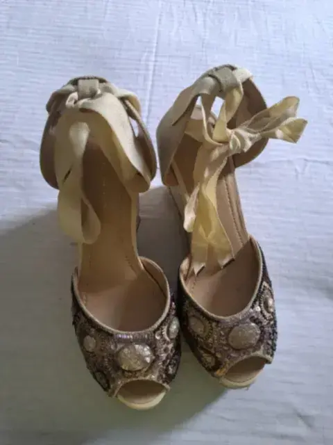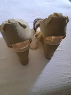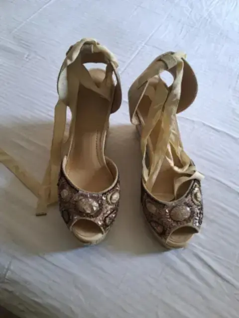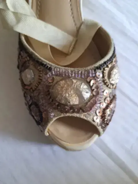 Alpargatas de plataforma con cintas para amarrar,color café claras y detalles de pedrería, son textiles con suela de caucho, son del número 25, una sola puesta, en excelente estado.
