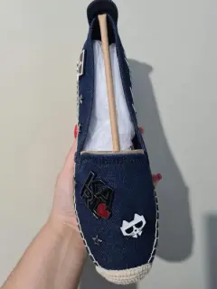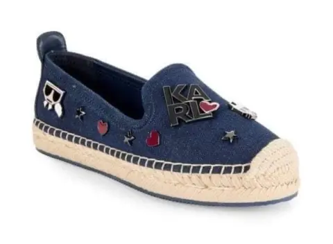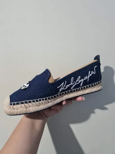 Bonitas alpargatas de la marca Karl Lagerfeld de mezclilla con los pines de la marca…están totalmente nuevas y son de temporada aún en tienda