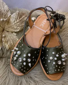 Hermosas sandalias verde olivo con lindos detalles de perlas y piedritas brillantes, con cintillas que decorarán tus piernas. Súper cómodas y muy adecuadas para la temporada. Talla: 26 México. ¡Producto nuevo en tendencia!