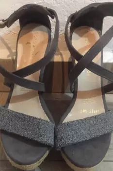 Sandalias de color corrido con brillos/piedritas plataforma corrida tipo ante ajustables al tobillo número 24.5 medida justa. Por falta de uso se comenzo a pelar por dentro, pero no se nota para uso