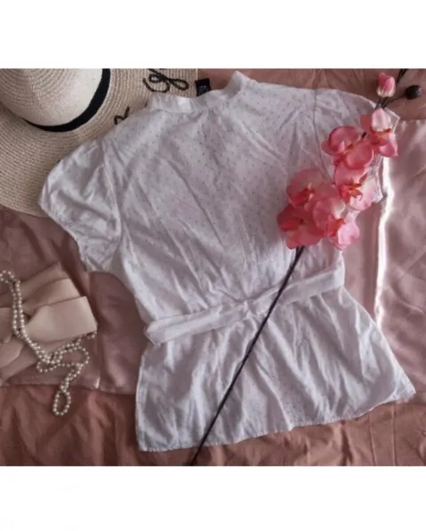 Blusa blanca básica se ajusta a l cintura, manga corta, tiene estampado de puntos