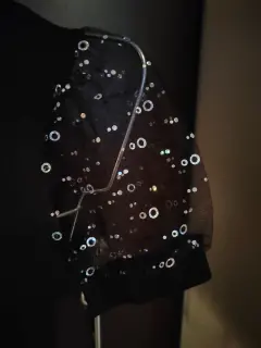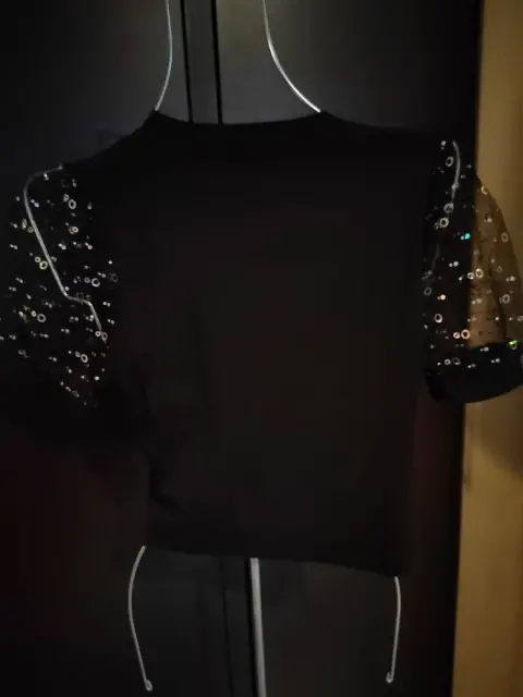 Barbie Blusa negra Crop con Bordado dorado. Barbie está de moda. Vístete con esta hermosa blusa negra corta, con bordado de Barbie dorado en lentejuelas al frente. A estrenar sin detalles.
