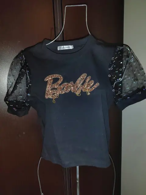 Barbie está de moda. Vístete con esta hermosa blusa negra corta, con bordado de Barbie dorado en lentejuelas al frente. A estrenar sin detalles.