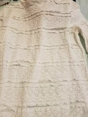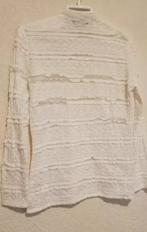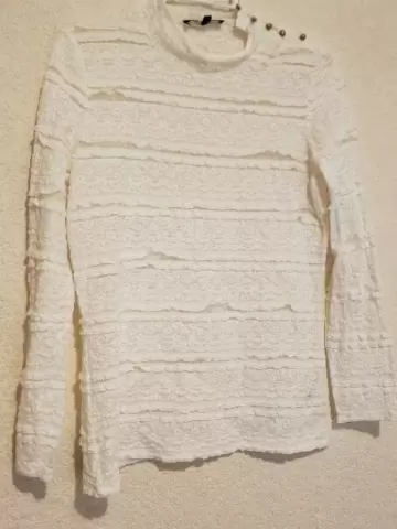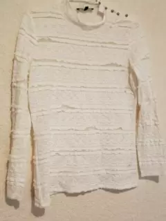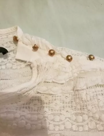 Bellísima blusita de encaje con detalles de botones dorados encima del hombro y solo de un costado, viene a la talla, y las fotos no le hacen justicia, de lo hermosa q esta.