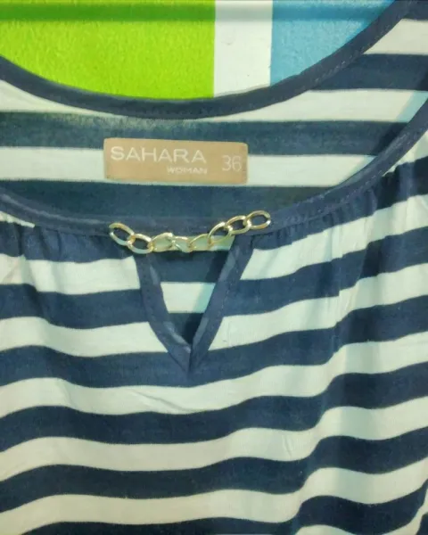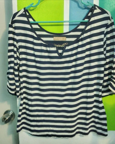Bonita blusa Marca Sahara Nueva sin etiqueta sin ningún detalle, la tela es delgada para tiempos de calor. Color azul marino con blanco rayada. Muy bonita. Detalle de cadena en el escote.