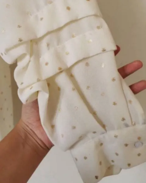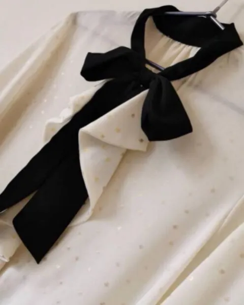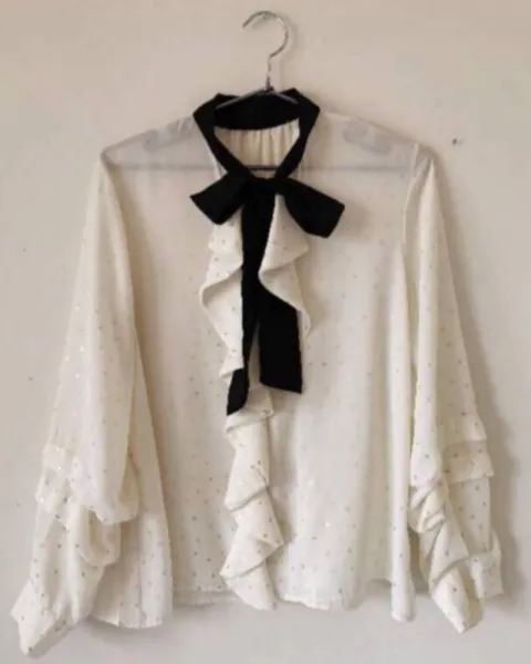 Blusa. Es muy bonita tiene olanes, un lazo negro al frente que le da un toque elegante y destellos dorados, tiene un ligero agujerito que es prácticamente imperceptible.