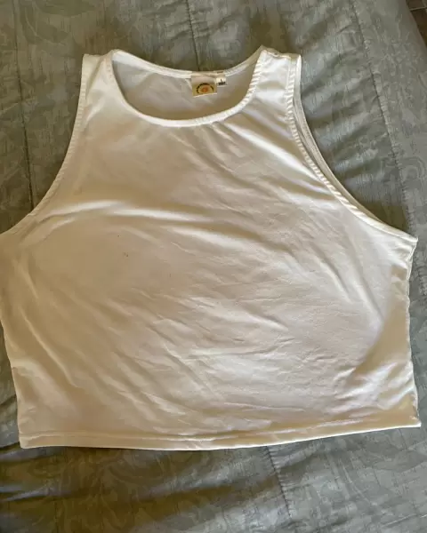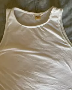 Descripción:Blusa básica, sin mangas, color blanco talla L, queda también a talla M