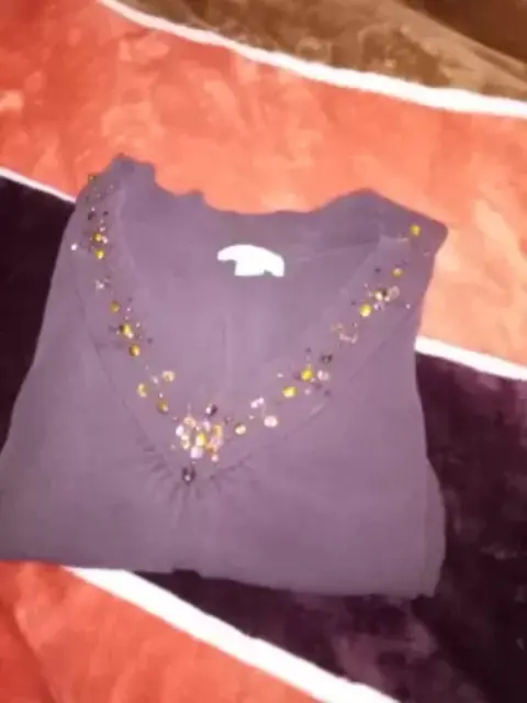 BLUSA 3/4. Es cafe, manga 3/4, cuello V, con piedritas enfrente, lisa viene amplia
