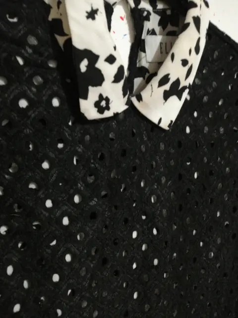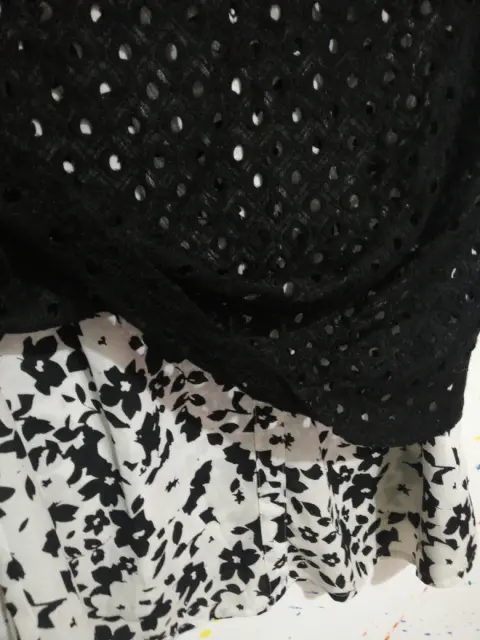 Blusa blanco con negro.Tela poliester, nylon y spandexTalla xsDraquelado en negro y fondo blanco con flores negras. Manga corta y cuello