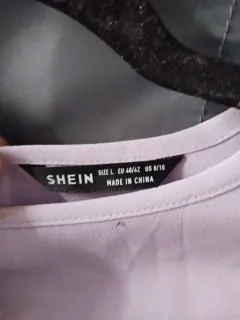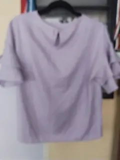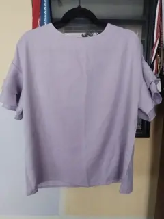 Blusa color Lila, talla L, marca Shein, botón pequeño en la parte de atrás, olanes en los brazos, manga corta