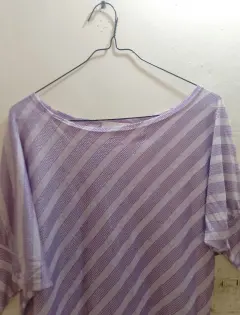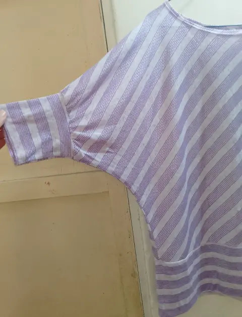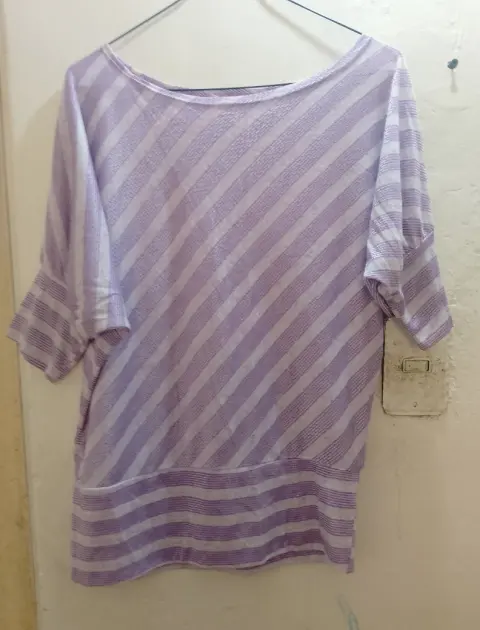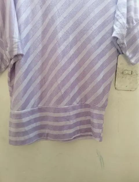 Blusa. Blusa color blanco, gris y lila, con manga ala de mosca, ajustada a la cintura