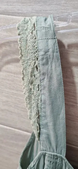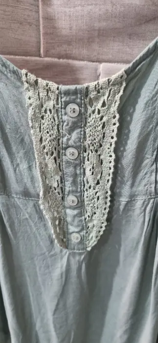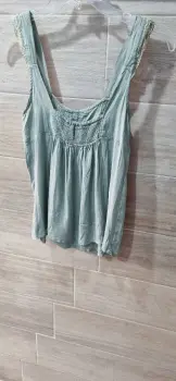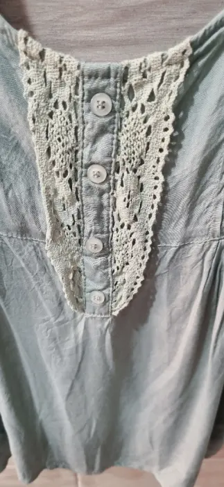 Blusa. Blusa satinada, color verde olivo con detalles tejidos en el mismo color.