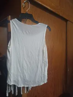 Blusa cuello redondo, sin manga, con adorno de barbas cruzadas, algodón color crudo