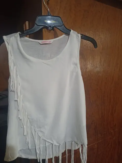 Blusa. Blusa cuello redondo, sin manga, con adorno de barbas cruzadas, algodón color crudo