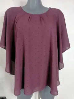 Blusa ,tipo blusón, trae una camiseta integrada marca Elle talla Chica, puede llegar a quedar a una talla mediana es color uva con puntitos negros, super cómoda