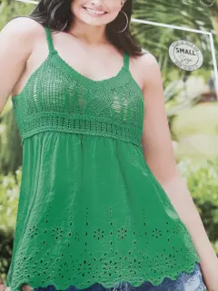 Blusa 995-22. Blusa color verde, algodón, detalles tejido y detalles bordado, de tirantes